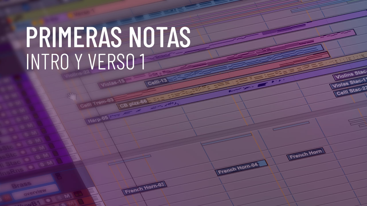 Las primeras notas orquestales para la intro y el verso 1. Comencé con cuatro notas suaves de corno francés referenciando el Tema de la Fuerza, luego introduje líneas de cuerdas emulando a John Williams — violines, violas, violonchelos y contrabajos construyendo cuerpos armónicos ricos. Grabé casi improvisando sobre la progresión, y luego separé las partes en instrumentos individuales.