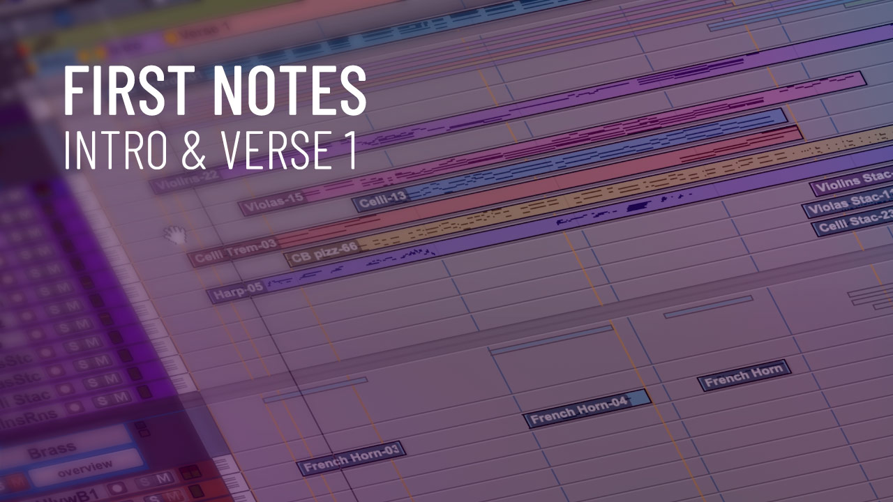 The first orchestral notes for the intro and verse 1. I started with four soft French horn notes referencing the Force Theme, then introduced string lines emulating John Williams — violins, violas, cellos, and basses building rich harmonic bodies. I recorded it almost improvising over the progression, then separated the parts into individual instruments.
